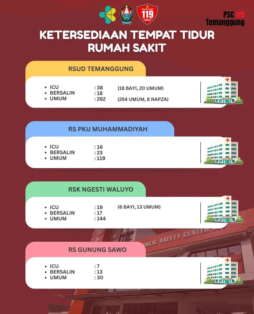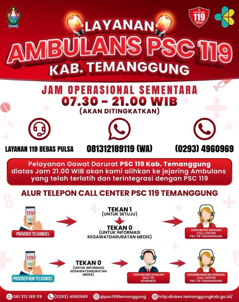 Berita Kategori: Smart Government (Pemerintah Cerdas) Senin, 19 Januari 2026 09:09:01 107 AMBULANS PSC 119 Selengkapnya Kategori: Smart Government (Pemerintah Cerdas) Senin, 19 Januari 2026 09:03:21 112 Layanan Gawat Darurat Medis PSC 119 DINKES TEMANGGUNG Selengkapnya Kategori: Smart Government (Pemerintah Cerdas) Senin, 19 Januari 2026 08:52:06 156 APLIKASI SISRUTE Selengkapnya Kategori: Smart Government (Pemerintah Cerdas) Senin, 19 Januari 2026 08:51:32 68 RUMAH SAKIT DAN KETERSEDIAAN TEMPAT TIDUR DI KAB. TEMANGGUNG Selengkapnya Kategori: Smart Government (Pemerintah Cerdas) Kamis, 21 Agustus 2025 14:45:58 901 PSC 119 Temanggung Siaga 24 Jam, Siap Layani Kegawatdaruratan Masyarakat dengan hotline 119 Selengkapnya